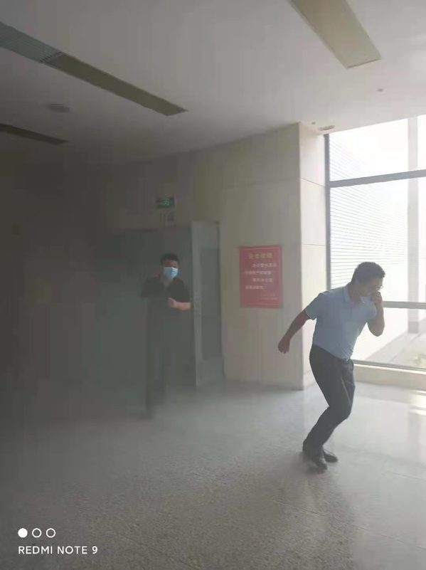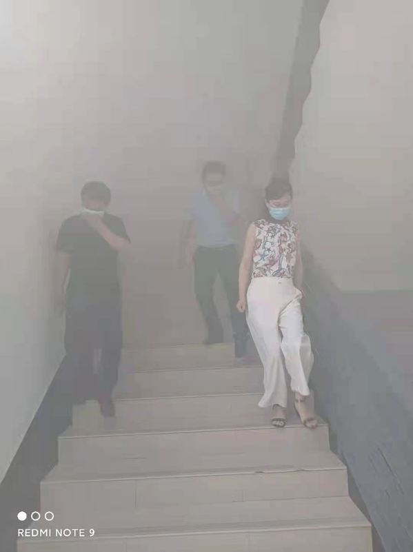 上午11:00,演习正式开始。保卫处在文科楼B区五层的学院办公区模拟释放烟雾并拉响警报,参与演习的师生听到警报之后按照预案立即疏散,分别从文科楼B区五层的东西两个安全出口迅速撤离到一楼大厅外的指定安全区域,演习取得圆满成功。