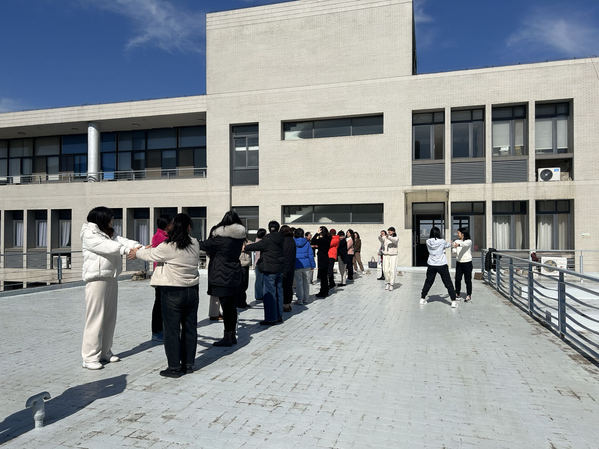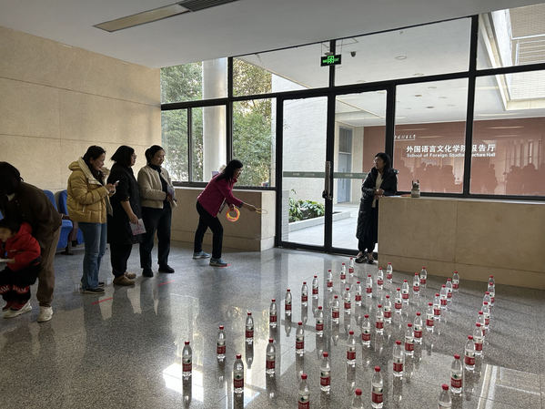 院妇委会主任陆老师宣布此次活动的安排和竞赛规则。大家移步户外,玩起了趣味横生又颇有挑战的“你拍我逃”的热身游戏。几轮游戏下来,大家很快感到放松和愉快。紧接着大家开始韵律健身操活动。二十余位女教师在轻松欢快的音乐声中自如地进行着各种健身动作。此次活动最精彩的环节当属各类竞技和比赛活动,老师们参加了跳绳、套圈、投壶、滚易拉罐和顶球跑等各项活动,互相挑战又互相合作,一时间笑声和欢呼声充满学院整个一楼大厅。