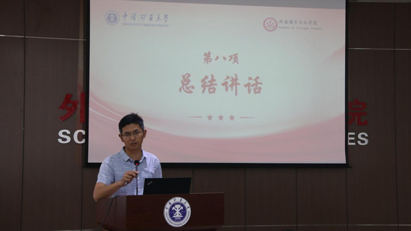 朱正中做总结讲话。他对新团员提出要求,一要筑牢信仰根基,做头脑清醒的外文人;二要练好专业本领,做讲好中国故事的外文人;三要脚踏实地奋斗,做知行合一的外文人。他勉励大家珍惜团员身份,努力成为“眼里有光、心里有爱、脚下有力、肩上有责”的新时代青年。