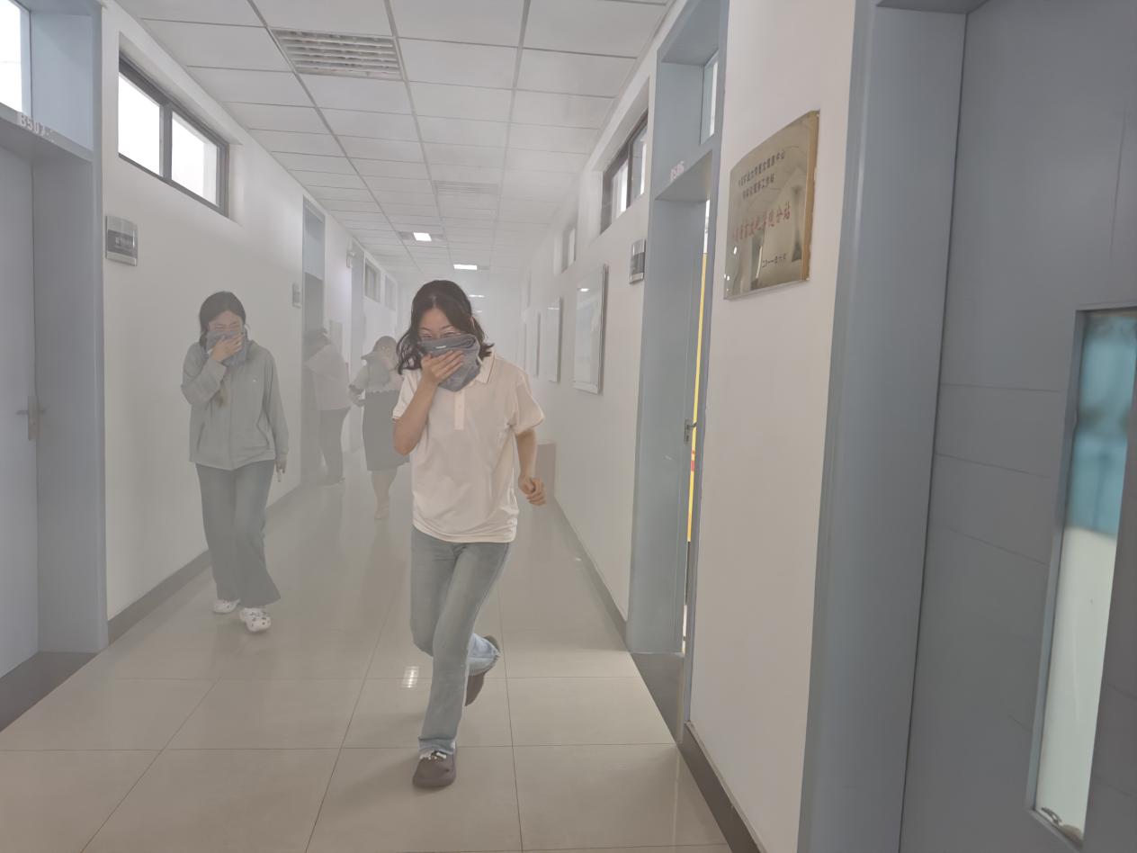 上午11时10分,随着一阵急促的消防警报声在学院楼内响起,演练正式启动。在模拟火灾场景中,工作人员在楼内迅速释放烟雾。师生们用湿毛巾捂住口鼻,弯腰低姿沿疏散指示标志从楼梯通道撤离。整个过程师生响应迅速、组织有序,达到了演练预期的效果。