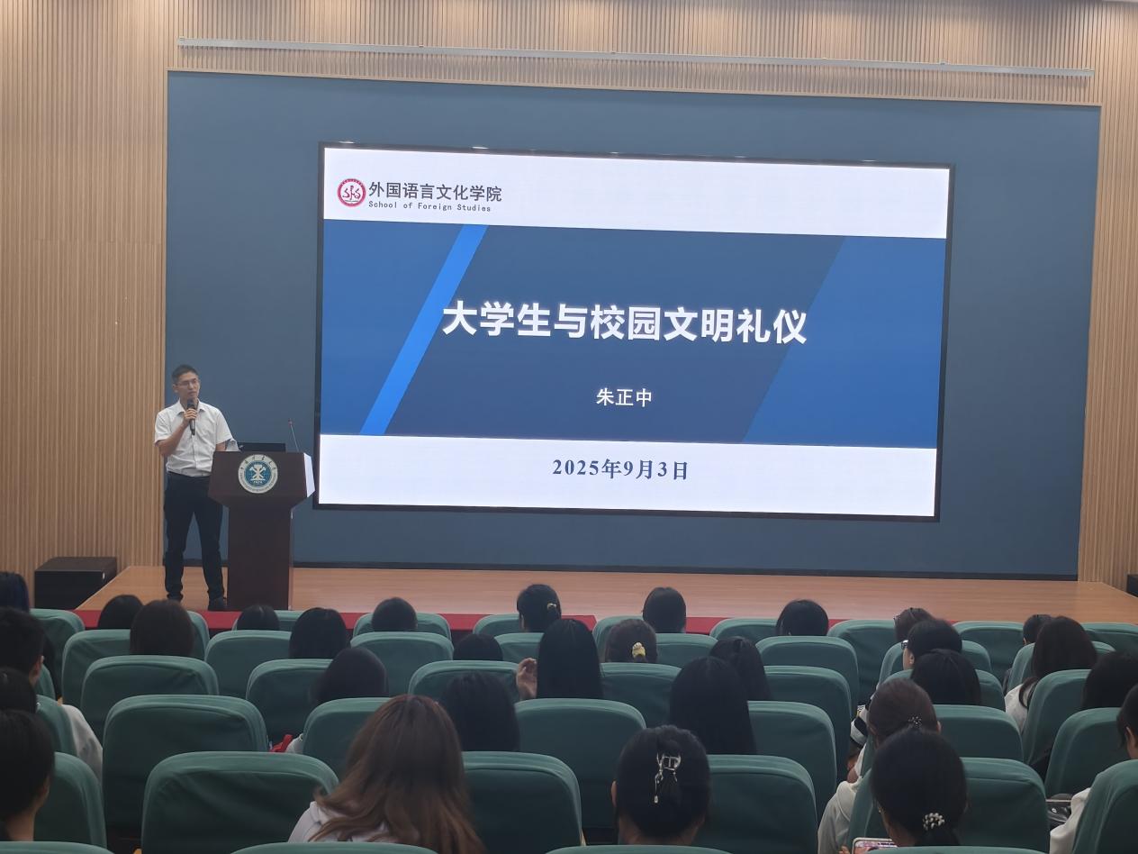 9月3日上午,巨乳人妻 在外文楼 B102 报告厅开展2025级新生入学文明礼仪及廉洁文化教育专题讲座。本次讲座由学院党委副书记朱正中主讲,辅导员付尚及全体2025级研究生、本科生共同参加。
