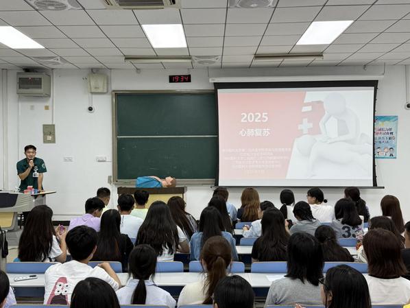 讲解结束后,若干名2025级新生依次上台进行实践操作,在老师和志愿者的指导下学习并完成了标准的心肺复苏过程,切实掌握了实操技能。