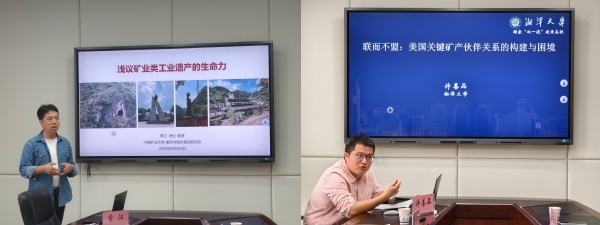 会议上半程为专家报告环节。常江教授以《浅析矿业类工业遗产的生命力》为题展开分享,他围绕“工业遗存如何转向工业遗产”这一主线,结合可视化图片、视频、数据统计图及典型案例,分析矿业类工业遗存的现状与价值,并介绍工业遗产成功转型的实践路径。常江教授强调,矿业遗产的生命力根植于人民,也服务于人民。因此,工业文化遗产的研究保护与发展始终要扎根于大地,要以服务于人民的需求为导向,让工业遗产在文化建设中发挥新的价值。许善品副教授则以《联而不盟:美国关键矿产伙伴关系的构建与困境》为题作报告,他从选题背景、概念界定、研究背景等七个方面展开论述,重点厘清“美国关键矿产伙伴关系”与“联盟”的概念差异,详细分析美国推动构建关键矿产伙伴关系的具体举措,以及该伙伴关系在实践中产生的影响,为区域国别研究与能源资源议题的结合提供学术视角。