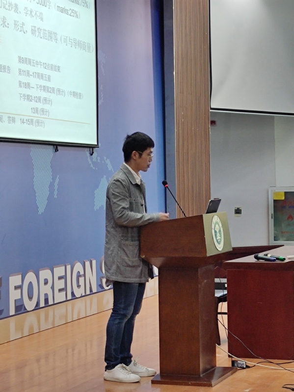 会议伊始,就毕业论文写作问题,唐书哲老师向大家提出几点建议。第一,坚决杜绝抄袭等学术不端行为;第二,论文选题要注意意识形态问题,坚持正确的政治立场;第三,鼓励同学们增加工作量,将正文写够8000词以上;第四,翻译材料的选取应和论文选题相关;第五,论文写作应注意语言的准确性和格式的规范性,在导师指导下多修改打磨;第六,论文写作期间,应主动与导师进行沟通。