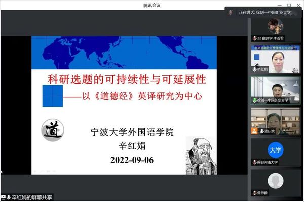 “博雅”学术论坛第十一期通过腾讯会议成功举行。该论坛由国际汉学与比较文学研究中心主办,邀请宁波大学外国语学院的辛红娟教授做了题为“科研选题的可持续性与可延展性——以《道德经》英译研究为中心”的讲座。本次论坛由徐剑院长主持,祖大庆副院长以及学院部分师生190余人共同参与。