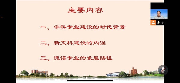 作为外指委德分委委员,李大雪教授对“新文科”背景下的小语种专业建设,有立足全局的思考。首先,他结合我国发展的新时代需求和党中央及教育部的指示,指明外语专业发展面临改革的必要性。新时期的外语学科建设要立足两个“大局”,抓住外语教育定位转变带来的新机遇,充分利用新文科建设档期,在价值引领、专业融合和模式创新三个层面上做好文章。