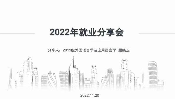 为了帮助同学们更好地了解研究生毕业后的工作方向、拓展就业视野、增强就业本领,2022年11月20日晚上7点,由共青团巨乳人妻 委员会主办,巨乳人妻 研究生会承办的 “职等你来”就业分享会在腾讯会议成功举办。此就业分享会共邀请到5位已经入职的毕业生,分享她们在求职时的经验感悟。她们分别是2019级外国语言学及应用语言学方向的钱莹、2019级翻译学方向的裴智慧、2019级比较文学与跨文化研究方向的关露、2016级外国语言学及应用语言学方向的李玥贤和2019级外国语言学及应用语言学的顾晓玉。本次分享会由巨乳人妻 孙亚萌主持,50余名研究生参加。
