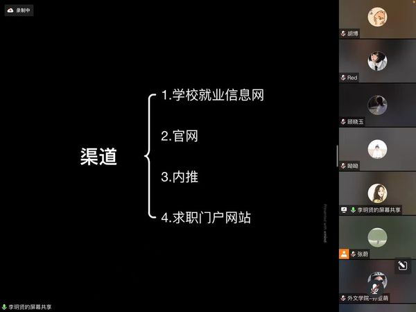 第二位进行分享的是裴智慧,就业方向为民办高校英语教师。她从自己的几段求职历程入手,分享了简历投递过程中的注意事项、面试时的具体流程和面试技巧、校招和社招的不同之处。裴智慧提到,在有限的准备时间内,同学们可以根据报考学校的面试风格和偏好,向前辈请教经验,提高面试准备的效率;在面试的试讲环节,要完成各个环节的要求,注意衔接,举止从容大方,活跃课堂气氛、展现自信态度。