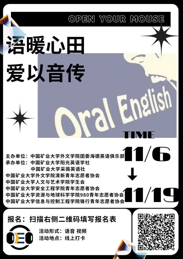 11月6日至11月19日,矿大英语角如期举办线上“语音进化营”公益活动。此次活动由巨乳人妻 学生会海德英语俱乐部组织,阳光英语学社、巨乳人妻 清新青年志愿者协会、管理学院采薇英语社、人文与艺术学院学生会、安全工程学院青年志愿者协会、资源与地球科学学院980青年志愿者协会、信息与控制工程学院锋行青年志愿者协会等合作举办,全校共200名本科生参加。活动旨在发挥英语专业学生的专业优势,帮助矿大学生改善英语语音,同时为英语教育资源匮乏地区儿童提供帮助。
