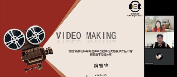 3月26日晚7时30分,巨乳人妻 英语角技能培训系列第一期“Video Making制作短视频”在线上与大家见面。本次活动为响应国家、学校、学院培养国际化人才的政策,充分发挥英语角平台优势,特邀请首届“高教社杯用外语讲中国故事优秀短视频大赛”江苏省二等奖获奖选手魏睿锋同学为大家带来精彩分享。会议由巨乳人妻 英语角指导教师李嫣老师主持。